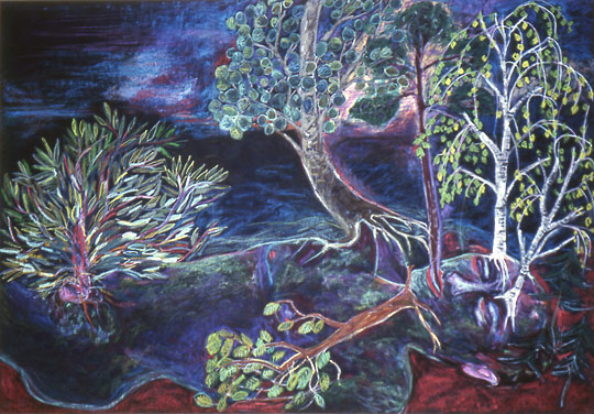 Maalauksessa Antero Vipunen on sammaloitunut ja kasvaa melko orjallisesti Kalevalassa lueteltuja puita. Kalevalassa kaikki puut kasvavat yläruumiista, mutta minä sijoitin pajun alapäähän. Haapa kasvaa hartioilta ja koivu kulmilta ylenee, kuusia ja mänty ja leppä vielä päänseudulla. Vipunen on sulautunut maisemaan todella sopusointuisesti ja lepää rauhassa luonnon kanssa.